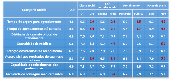 Segmentos vulneráveis da população, com menor escolaridade e renda, são os mais impactados pelas barreiras. Entre os que integram as classes D/E e entre os que se autodenominam de cor preta, por exemplo, notas médias abaixo de cinco ocorrem em boa parte dos fatores contemplados no estudo. Ainda entre os que dizem pretos, o grau de insatisfação com a quantidade de médicos e com os prazos para agendamento e consulta alcançam patamares próximos a 90%.
