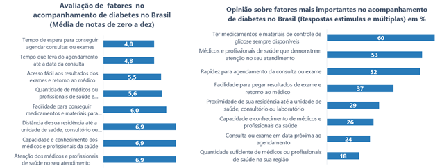 A quantidade de médicos (5,6) e a dificuldade de acesso a resultados de exames (5,5) também têm desempenho abaixo da média. A facilidade para conseguir medicamentos, (que recebe nota 6,0) figura como importante vetor, especialmente ao se considerar o valor que os entrevistados atribuem ao tema – 60% o apontam como um dos três principais fatores para o acompanhamento adequado da doença no país. Veja os dados.